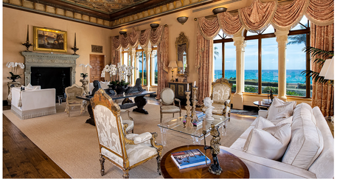 The seven-bedroom home was originally built in 1919 by famed architect Addison Mizner and has been substantially upgraded since then, though it still retains such noteworthy period details as hand-stenciled ceilings and coquina stone accents. Photos show a lavish living room anchored by an oversize, carved-mantel fireplace, with a wall of windows facing the water. One unusual architectural feature is that the property actually shares a wall with a two-story guest apartment towned by Patterson, which, in turn, is linked to Patterson’s main house by a second-floor bridge. It therefore appears as though Lennon and Ono’s former home and Patterson’s are linked, though they are not.