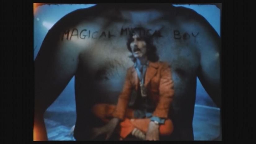 The “Blue Jay Way” segment of the film Magical Mystery Tour is as advanced, for the time, as the recording. The scene starts with everyone on the bus cramming themselves into a little tent, which opens into a space large enough to house a theatre. A a film within a film is projected on ultimate Beatle insider and designated “Magical Mystery Boy” Mal Evans’ chest, while the other Beatles watch, Lennon riding Ringo’s two year old son Zak’s rocking horse. The sequence mixes numerous experimental film techniques. A cat’s face is projected onto Harrison’s face. The filmmakers use prismatic photography and refracted images.