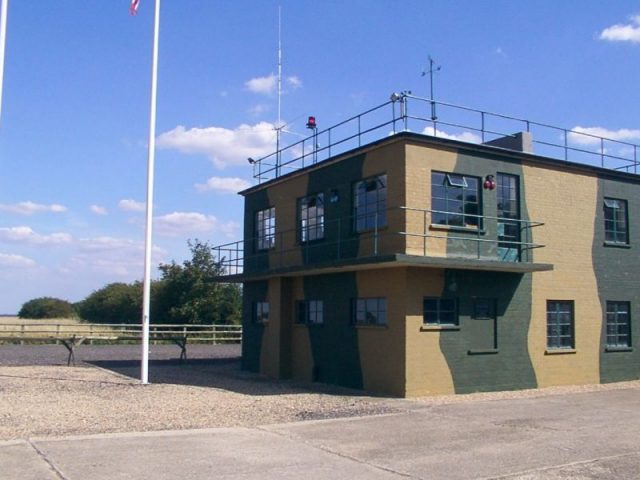 RAF Twinwood Control Tower restored in 2002. It contains a tribute to Major Alton Glenn Miller who took his final flight from here on December 15, 1944. Photo by MilborneOne CC BY SA 3.0