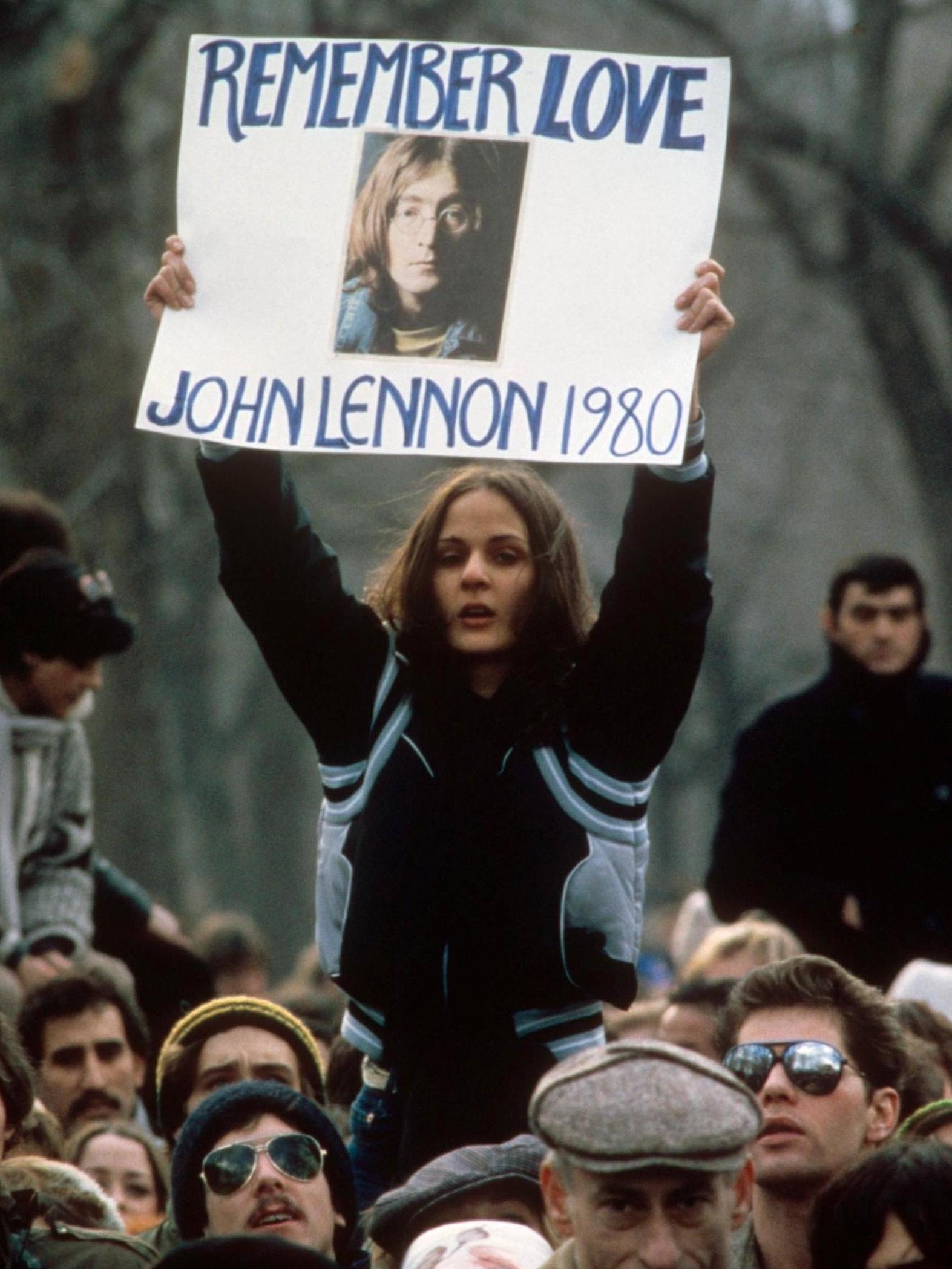 Mourning: a fan holds a sign remembering the murdered Lennon at a New York memorial in December 1980 (Shutterstock)