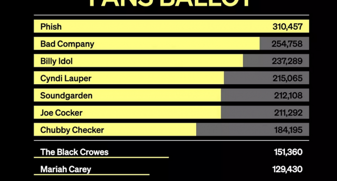 With less than a week left of Rock Hall fan voting, there is currently a clear frontrunner: Phish. As of the morning of April 16, the jam band holds a strong lead over the competitors with 310,457 votes. In second place is Bad Company with 254, 758, followed by Billy Idol with 237, 289.It appears Phish may go wire to wire in the fan voting department — back in February when voting first began, Phish also held the top spot.Fan voting will end on April 21. Until then, you can vote for up to seven artists once a day. Inductees will be announced later this month.