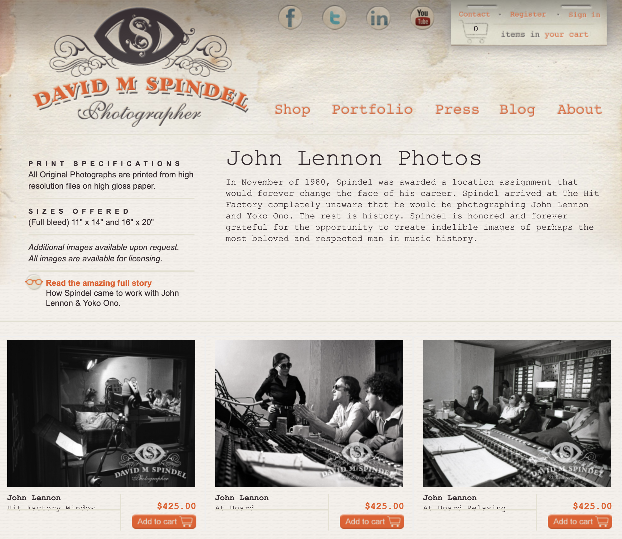 In 1980, through a remarkable chain of events, John Lennon and Yoko Ono hired Spindel to photograph their return to the studio for the Double Fantasy sessions. He became the last photographer entrusted with documenting them together during this intimate and historic period. His images have since appeared in books, documentaries, CDs, videos, and posters worldwide. In 2026, twenty two of his photographs will appear in Steven Soderbergh’s film John Lennon: The Last Interview.