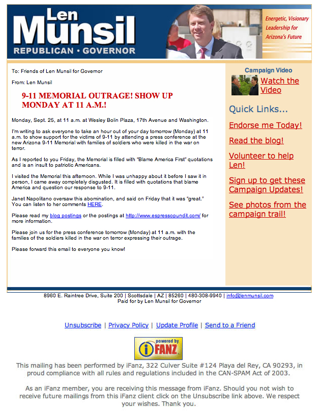 Besides developing McCartney product, sales and financial strategies, Outsource has introduced the iFanz system to the world of politics. Using iFanz as creative and email deployment engine, candidate Len Munsil of Arizona brought more awareness of current issues to the voter via a creative iFanz email campaign.